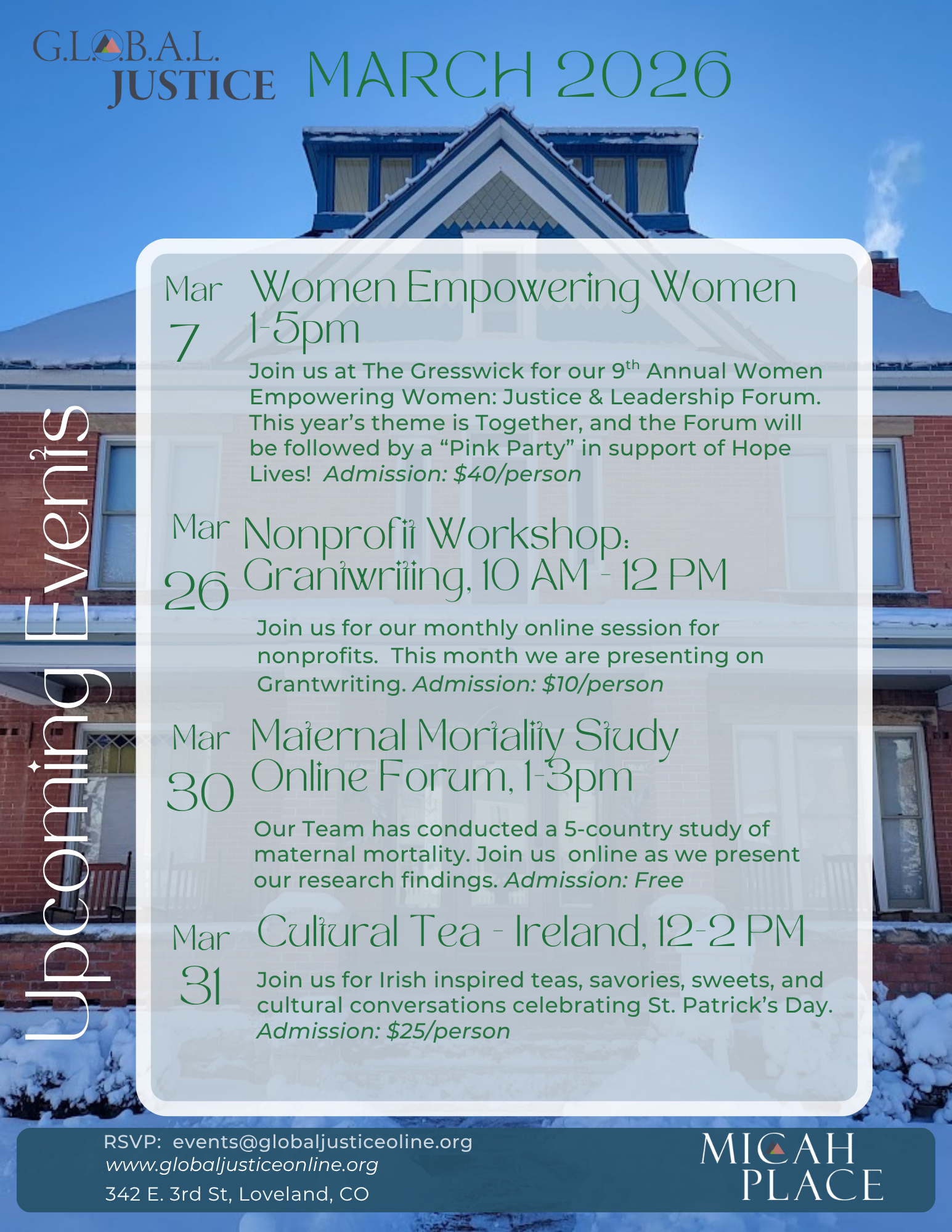 Micah Place, the “Home” of G.L.O.B.A.L. Justice, is located in the historic Hahn House in Loveland, Colorado. Micah Place houses our offices, programs, projects, services, and events. Reserve our meeting and event rooms to Connect. Gather. Celebrate. with your organization and community.