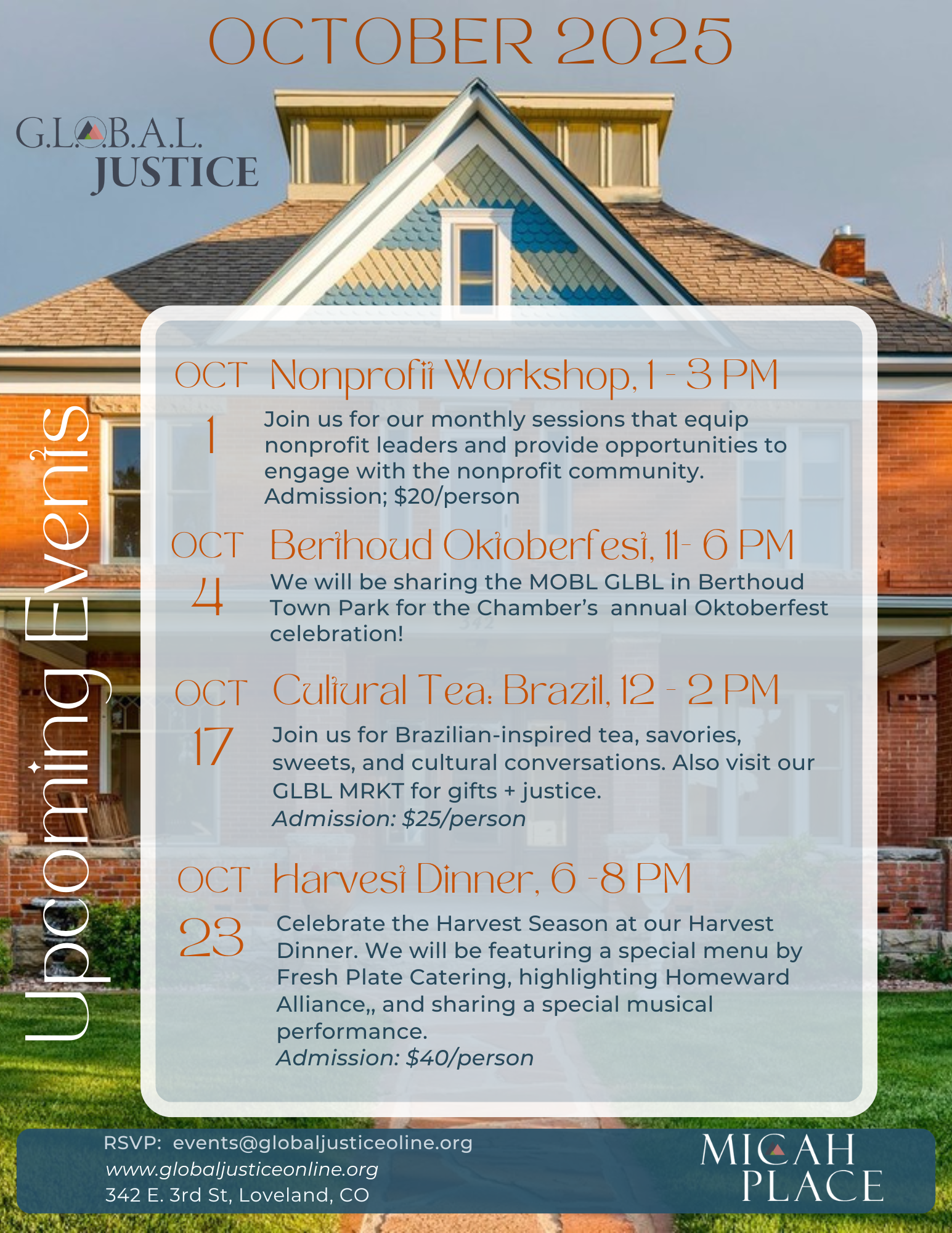 Micah Place, the “Home” of G.L.O.B.A.L. Justice, is located in the historic Hahn House in Loveland, Colorado. Micah Place houses our offices, programs, projects, services, and events. Reserve our meeting and event rooms to Connect. Gather. Celebrate with your organization and community.